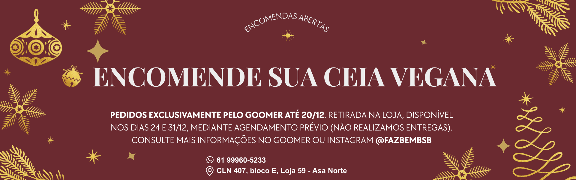Além disso, oferecemos a comodidade de refeições congeladas e um empório repleto de produtos veganos, como areppa de milho, carne de jaca, kombucha, kibbeh congelado, pizzas, mantegana, linguiça, queijos vegetais e muito mais. Faça suas encomendas pelo aplicativo Goomer ou visite nossa loja física na 407 Norte.